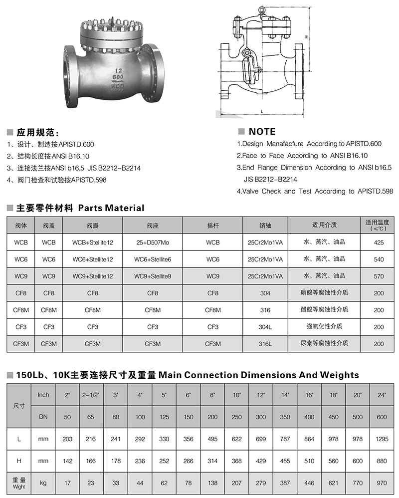 H44美標旋啟式止回閥適用于石油、化工、水力、火力電站等各種工況的管路上,切斷或接通介質。適用介質為:水、油品、蒸汽等。